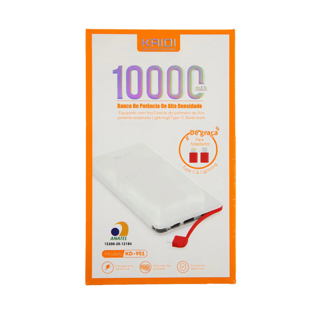 O Power Bank Kaidi 10.000mAh Slim garante energia extra com praticidade, segurança e mobilidade para a rotina diária. Com design fino, leve e moderno, oferece autonomia para o dia inteiro sem ocupar espaço no bolso, mochila ou bolsa, sendo ideal para trabalho, estudos, viagens ou uso intenso fora de casa.